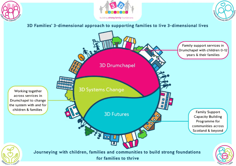 This new dimension to 3D’s work is driven both by an ambition to strengthen family support more widely and by the need to diversify income in a challenging funding environment. And in sharing their learning outwardly, they also bring new insight back into Drumchapel – a reinforcing loop of practice and reflection.